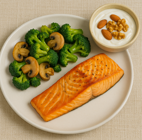 연어구이: 연어에 소금, 후추를 뿌리고 구워요. 채소볶음: 브로콜리와 버섯을 볶아요. |