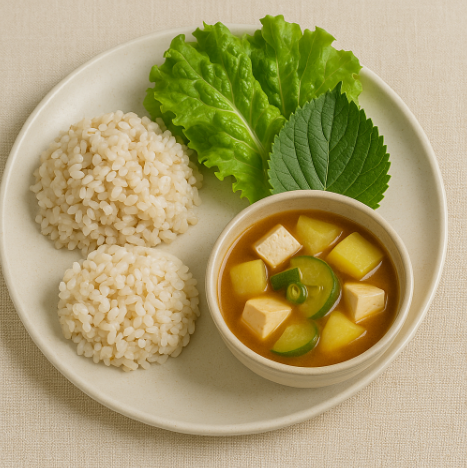 보리밥: 보리와 쌀을 섞어 밥을 짓습니다. 된장찌개: 된장, 두부, 애호박, 감자 등을 넣고 끓여요. 쌈채소: 상추와 깻잎을 깨끗이 씻어 준비해요. |