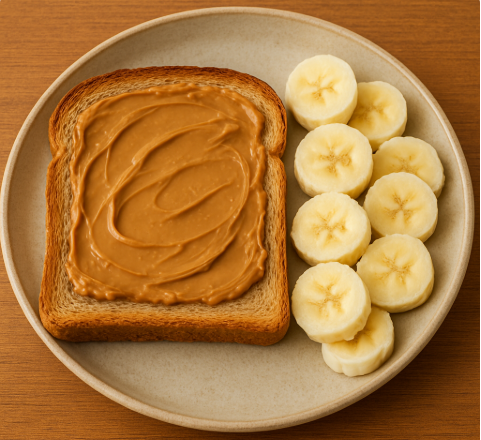 통밀식빵: 통밀빵을 토스터기에 구워요. 땅콩버터 바르기: 구운 빵에 땅콩버터를 고루 펴 발라요. 바나나: 바나나를 껍질 벗겨 적당한 크기로 잘라요. |