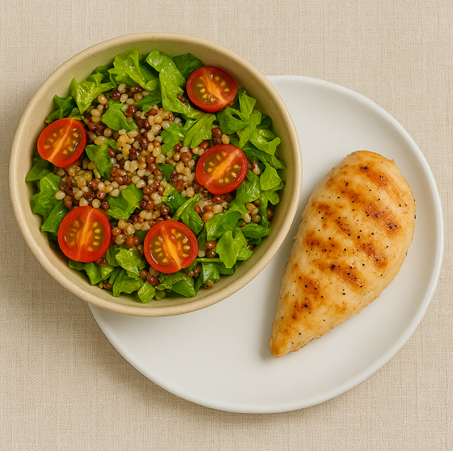 | 점심 | 통곡물 샐러드 + 닭가슴살 | 통곡물 샐러드: 현미, 퀴노아 등을 삶아 찬물에 헹군 뒤 물기를 빼요. 채소(양상추, 방울토마토)를 씻고 잘라서 섞어요. 올리브오일과 발사믹 식초로 드레싱을 만들어요. 닭가슴살: 닭가슴살에 소금과 후추를 뿌려 구워요. |