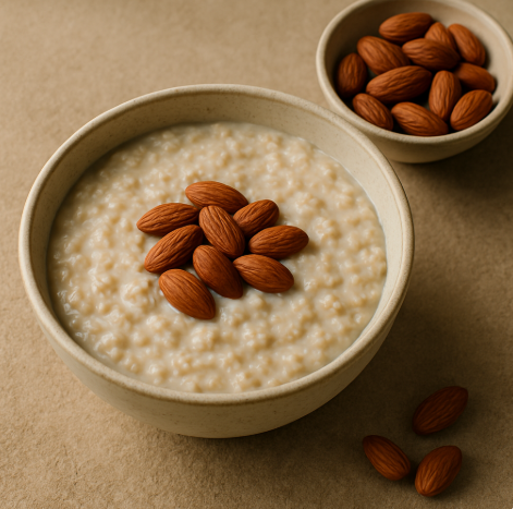 귀리죽: 귀리를 물에 불린 후 약불로 끓여 죽을 만들어요. 아몬드: 구운 아몬드를 곁들여 먹어요. |