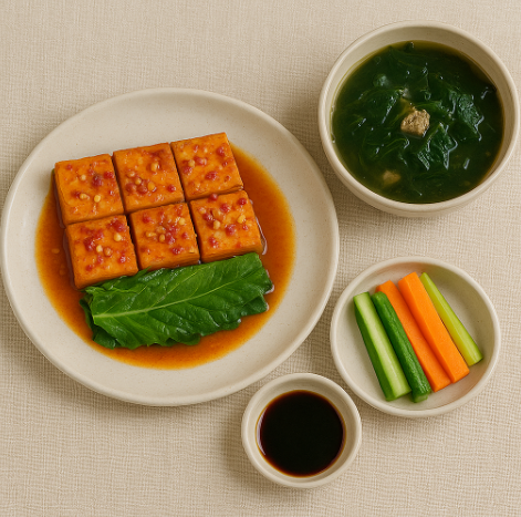 두부조림: 두부를 간장, 고춧가루, 마늘로 양념하여 졸여요. 미역국: 미역을 불려서 쇠고기와 함께 끓여요. |