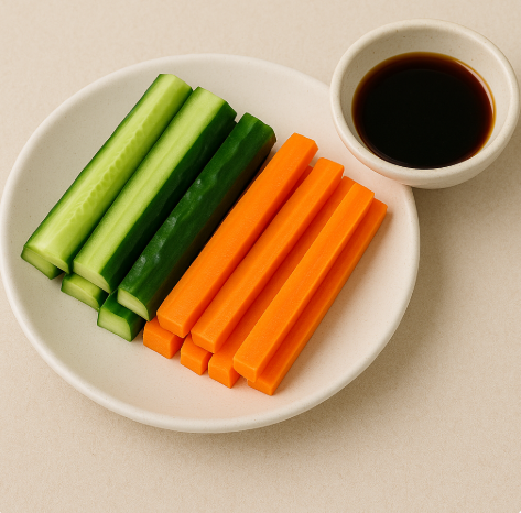 간식: 오이 + 당근스틱 오이와 당근을 길게 잘라 간장에 찍어 먹어요. |