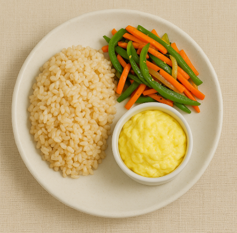 | 월요일 | 아침 | 현미밥 + 야채볶음 + 계란찜 | 현미밥: 현미를 깨끗이 씻어 물과 함께 밥솥에 넣고 취사 버튼을 눌러요. 야채볶음: 채소(양파, 당근, 피망 등)를 얇게 썰어요. 기름 두른 팬에 채소를 넣고 소금, 후추로 간하여 볶아요. 계란찜: 계란 두 개를 깨서 소금 조금 넣고 잘 저어요. 그릇에 담아 전자레인지에서 3분 정도 익혀요. |